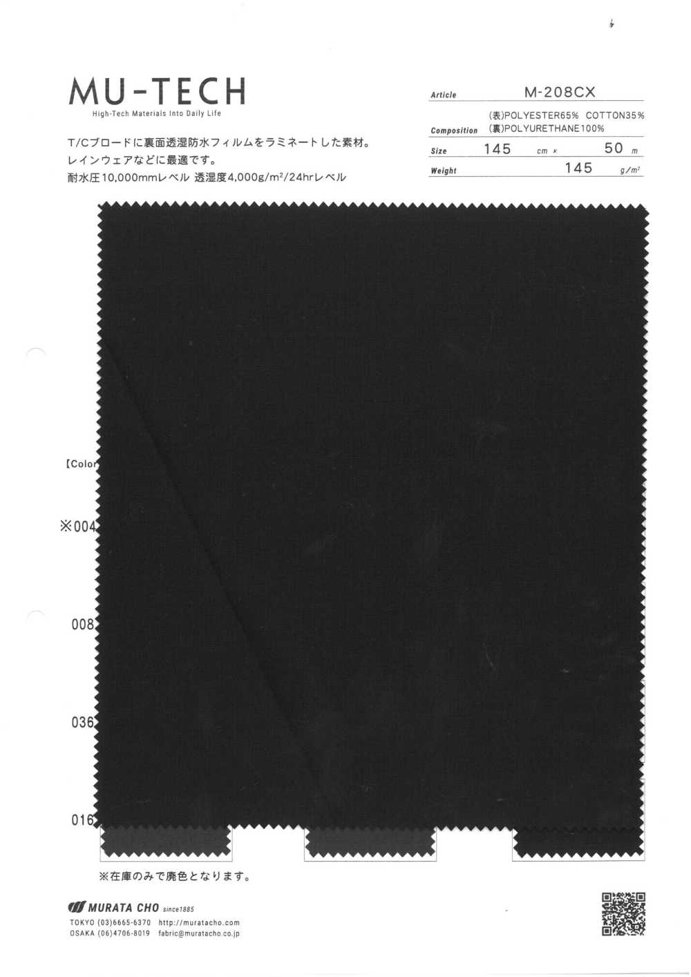 M-208CX T/C Broadcloth, Breathable Waterproof Fabric, Murata Cho