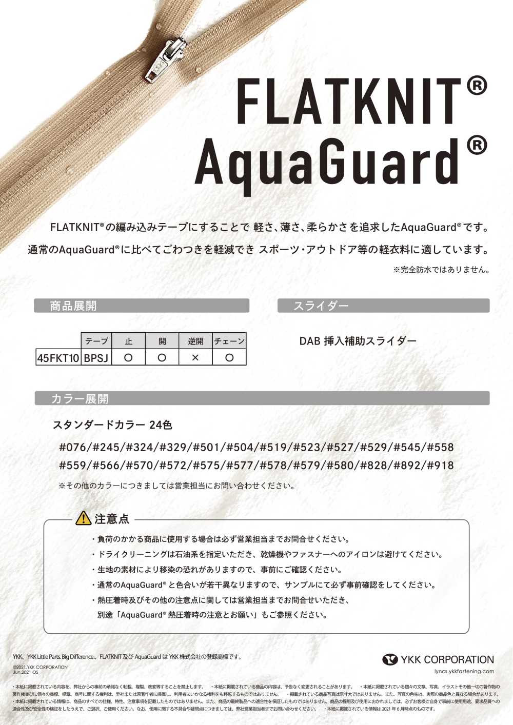 Aquaguard® achieves lightness, thinness, and softness by incorporating FLATKNIT® woven tape. Compared to regular AquaGuard®, it reduces stiffness and is suitable for lightweight clothing such as sports and outdoor wear.