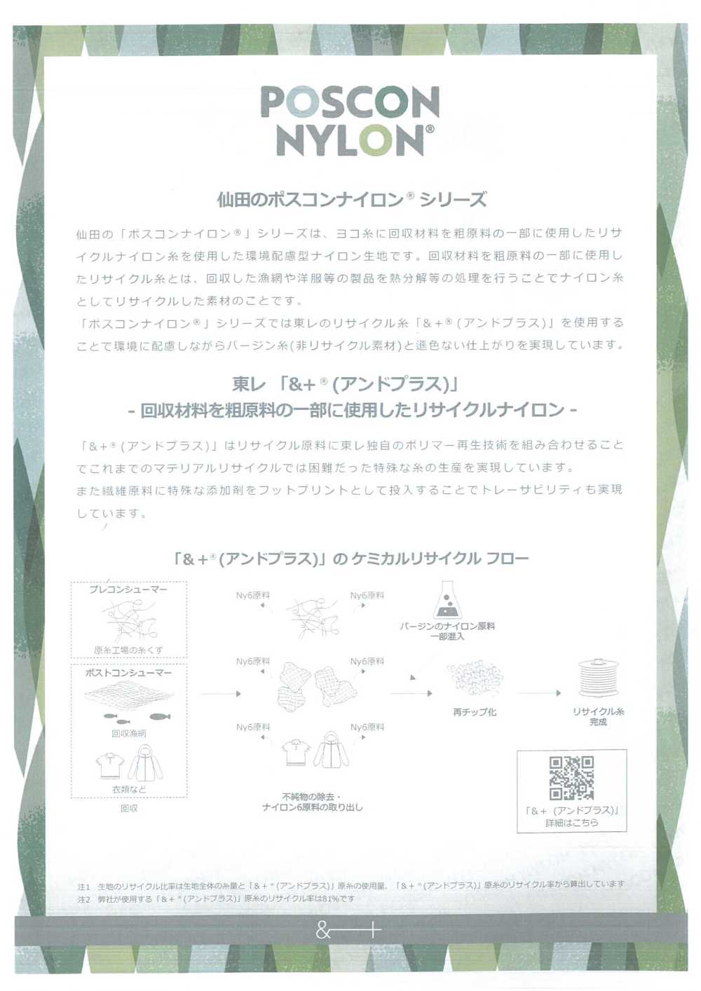 This is a medium-weight nylon twill fabric made with environmentally friendly materials, using Toray's 210-denier TORAY-consumer blend recycled thread "& + ®︎" in the weft thread and treated with PFAS-free C0 water repellency.