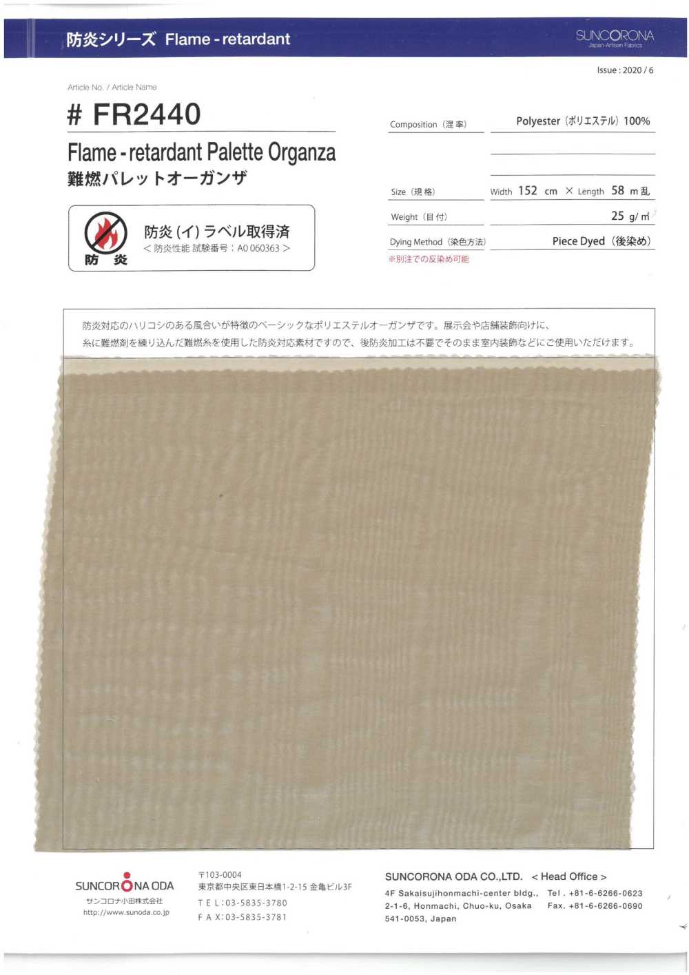FR2440 Flame-retardant polyester organza [fabric] Sun Corona OdaFR2440 Flame-retardant polyester organza [fabric] Sun Corona Oda
